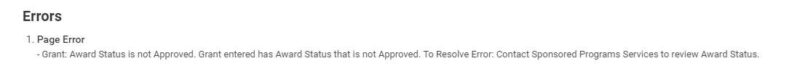 To prevent this error, please wait to charge expenses to the Grant until it is fully set up. Contact Sponsored Programs for status updates on in-progress setups.
