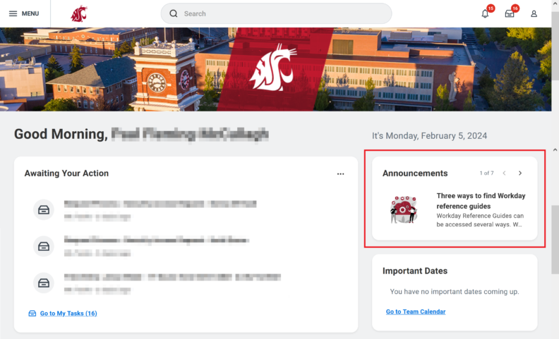 Learn more about how WSU uses Workday Announcements to help keep you up to date with the latest Workday news, resources, and more.