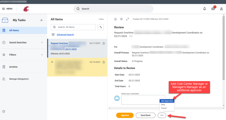 When reviewing overtime requests, HR Partners and Time Approvers are now able to send the request to the Cost Center Manager or the Manager’s Manager by selecting the “Add Approvers” option, located under the “Related Actions” icon located to the right of “Send Back.”