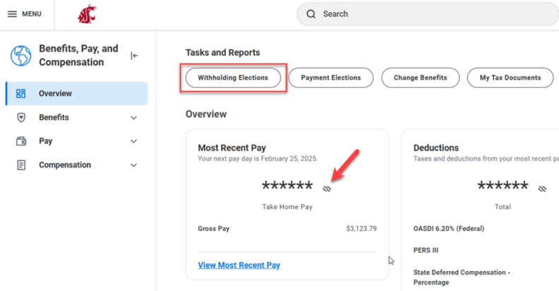 A screenshot of the enhanced Benefits and Pay Hub, featuring the new obscured financial values, with an arrow indicating the eye icon to reveal the information.