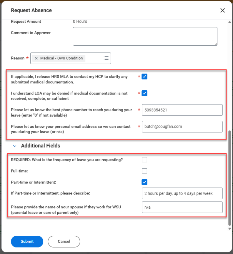Previously, employees needed to complete a questionnaire as a secondary step after submitting their initial leave of absence request. Moving forward, the questions appear directly on the absence request event under the additional fields section.